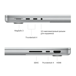 Порты расположены традиционно: слева находятся разъем MagSafe 3 для зарядки, два порта Thunderbolt 4 и аудиоразъем 3,5 мм. Справа расположены третий порт Thunderbolt 4, разъем HDMI и слот для карт SDXC. Такое расположение обеспечивает удобство подключения периферии с любой стороны.